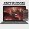 Two countdown features work together. The password page countdown is a full-screen timer customers see before your store goes live — set a date and time, and it counts down automatically. The announcement bar countdown is a persistent bar at the top of every page once your store is live — use it for drop end times, sale deadlines, or shipping cutoffs. Both are configurable in the theme editor with no code needed.