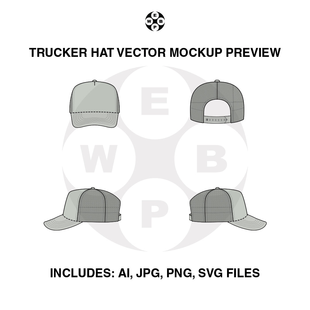 Upgrade your design game with our Trucker Hat Vector Mockup by Webexp! Inspired by the well known OTTO Trucker hats. This versatile mockup includes .AI, .JPG, .PNG, and .SVG files, making it compatible with all design softwares. Save time and unleash your creativity with our high-quality vector mockups.